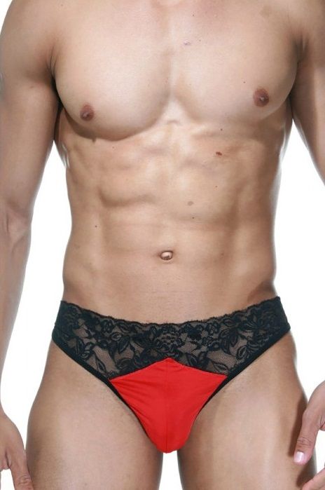 Мужские трусы-танга из черного кружева, с ярко-красной, гладкой вставкой спереди.
