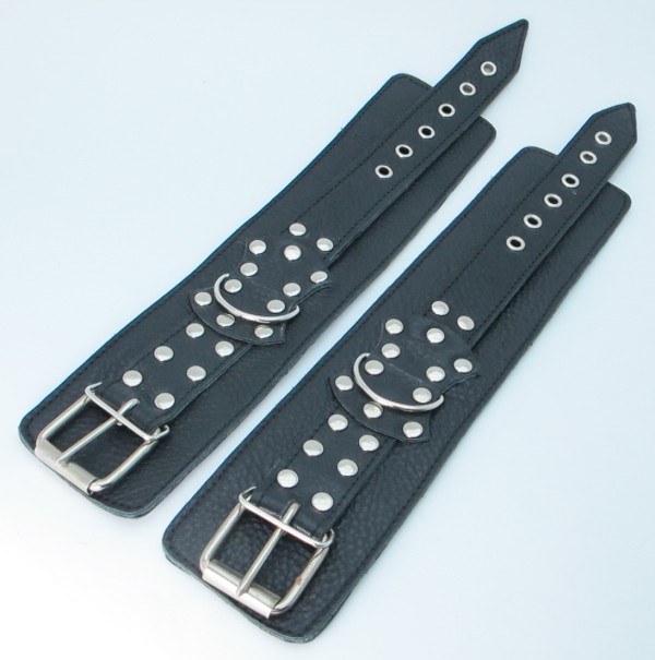 Кожаные наручники черного цвета. Украшены заклепками и соединяются между собой цепью с карабинами. Размер наручников регулируется при помощи застежки Ширина - 6 см. Длина цепочки - 15,5 см.