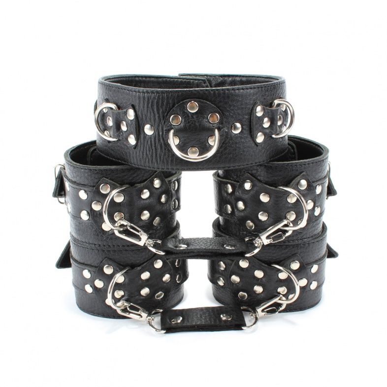 Набор аксессуаров, изготовленных из натуральной кожи. В него входят: наручи и поножи, украшенные заклепками, которые можно соединять и комбинировать между собой при помощи цепей с карабинами (входят в комплект) Размер меняется при помощи застежки. Также имеется черный ошейник с одним кольцом. Размер регулируется застежками на кнопках. Ширина наручников и поножей - 6 см. Ширина ошейника - 4,5 см.