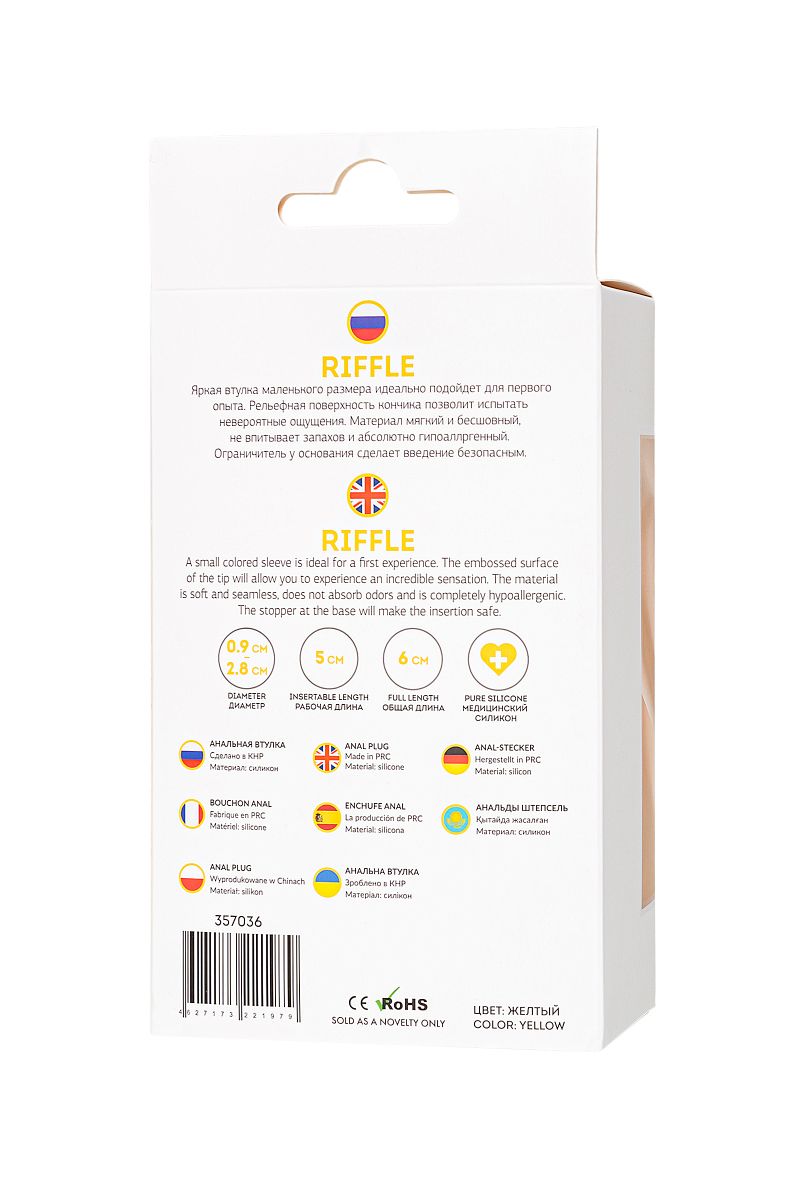 В секс-шопе Orgasmix вы можете купить Желтая анальная втулка Riffle - 6 см. артикул 222894 по цене руб. с доставкой в город Миасс. Мы осуществляем доставку по всей России. Ближайшая дата отправки этого товара . Заказы принимаются круглосуточно через интернет-магазин.