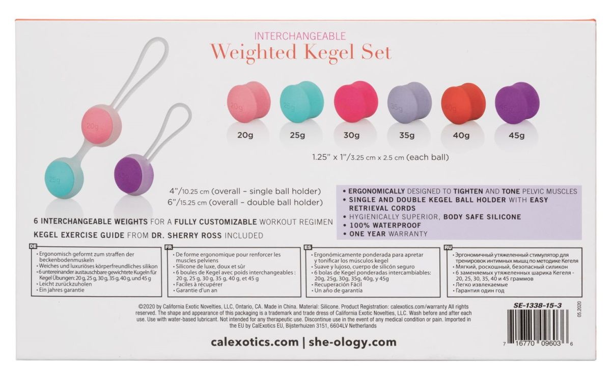 Набор сменных утяжелителей Кегеля She-ology – один из самых удобных наборов для оптимальной результативной поэтапной тренировки и прокачки мышц тазового дна. Набор из 6 шаров Кегеля с регулируемым весом, созданный для обеспечения полностью настраиваемого режима тренировки, можно смешивать и сочетать с одинарным или двойным держателем шаров, чтобы дать мышцам именно то, что им нужно. Набор грузов включает шары по 20 г, 25 г, 30 г, 35 г, 40 г и 45 г. Силиконовый набор премиум-класса безопасен для тела, не содержит запаха и фталатов. Идеальные вагинальные тренажеры для повышения тонуса интимных мышц и снизить вероятность болезней мочеиспускательной системы. Миниатюрные веса работают на увеличение сексуального возбуждения, создание тонуса и укрепление мышц таза. Проработка ключевых вагинальных мышц снижает риск заболеваний тазового дна или недержания мочи, одновременно увеличивая эротическое удовольствие. Удобный шнурок позволяет легко извлечь тренажер при необходимости в любой момент. Для комфортности введения и получения максимально приятных ощущений рекомендуем использовать смазку на водной основе. Очищать игрушку желательно до и после использования. Можно помыть в теплой воде с мылом или воспользоваться специализированным чистящим средством. Перед хранением шарики необходимо хорошо просушить. Желательно хранить отдельно от других силиконовых изделий. В комплекте: 2 держателя, 6 шариков. Длина двойного держателя - 15,25 см., одинарного - 10,25 см. Вес шариков - 20 гр., 25 гр., 30 гр., 35 гр., 40 гр., 45 гр.